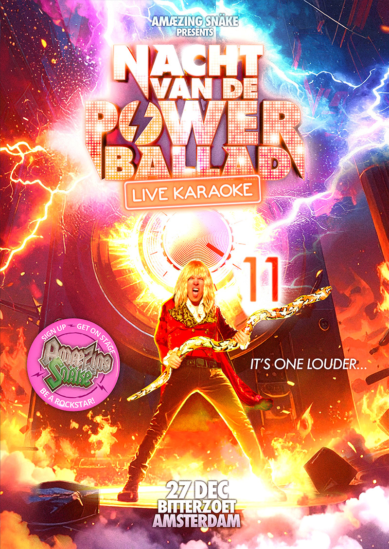 Amaezing Snäke is een rockende live karaoke-band. Dat betekent: gillende gitaren, wapperende haren, zwoele powerballads en stampende rock classics, allemaal gezongen door JOU. Van Bonnie Tyler en Whitesnake tot Bon Jovi en Queen: Amaezing Snäke speelt ze allemaal en JIJ mag ze met de Amaezing Snäke op het podium zingen.